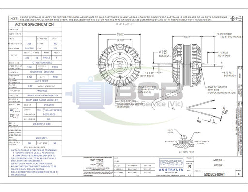 BCB Sales & Service (Vic)In stockFasco 50D502-80A 240V 20 Watts 4Pole (1350rpm) BI- Directional Twin Shaft 5/16" Single Speed 12 Months Warranty FREE SHIPPING ON THIS PRODUCT Cli...