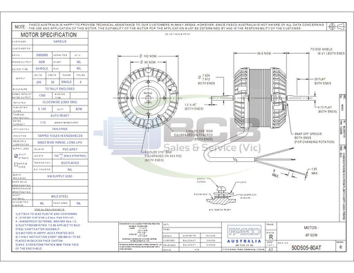 BCB Sales & Service (Vic)Low stockFasco 50D505-80A 240V 60 Watts 4Pole (1300rpm) BI- Directional Twin Shaft 5/16" Single Speed 12 Months Warranty FREE SHIPPING ON THIS PRODUCT Cli...
