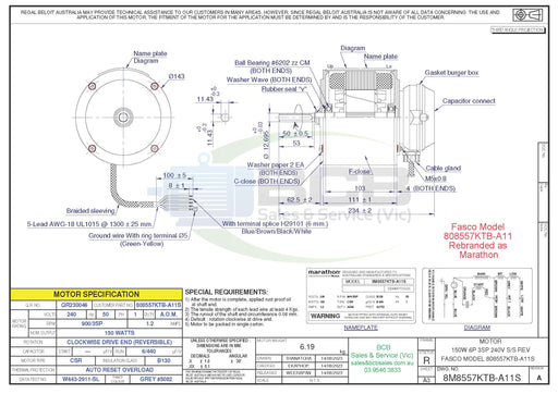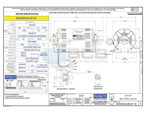 FASCO ( MARATHON ) BRIVIS 80945BQVB-B11 750W EVAPORATIVE COOLER MOTOR 4POLE (1400RPM) VARIABLE SPEED