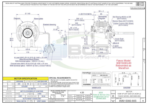 BCB Sales & Service (Vic)In stock300 Watts 6 Pole (910rpm) 3 Speed 240V Condenser Fan Motor Clockwise, Totally Enclosed Weatherproof 12 Months Warranty FREE SHIPPING ON THIS PRODUC...